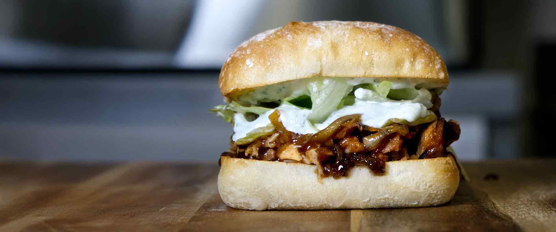 Pan brioche rojo, hamburguesa de Angus (150g), tomate, queso cheddar, cebolla caramelizada, panceta curada, mézclum, polvo de maíz, salsa verde.